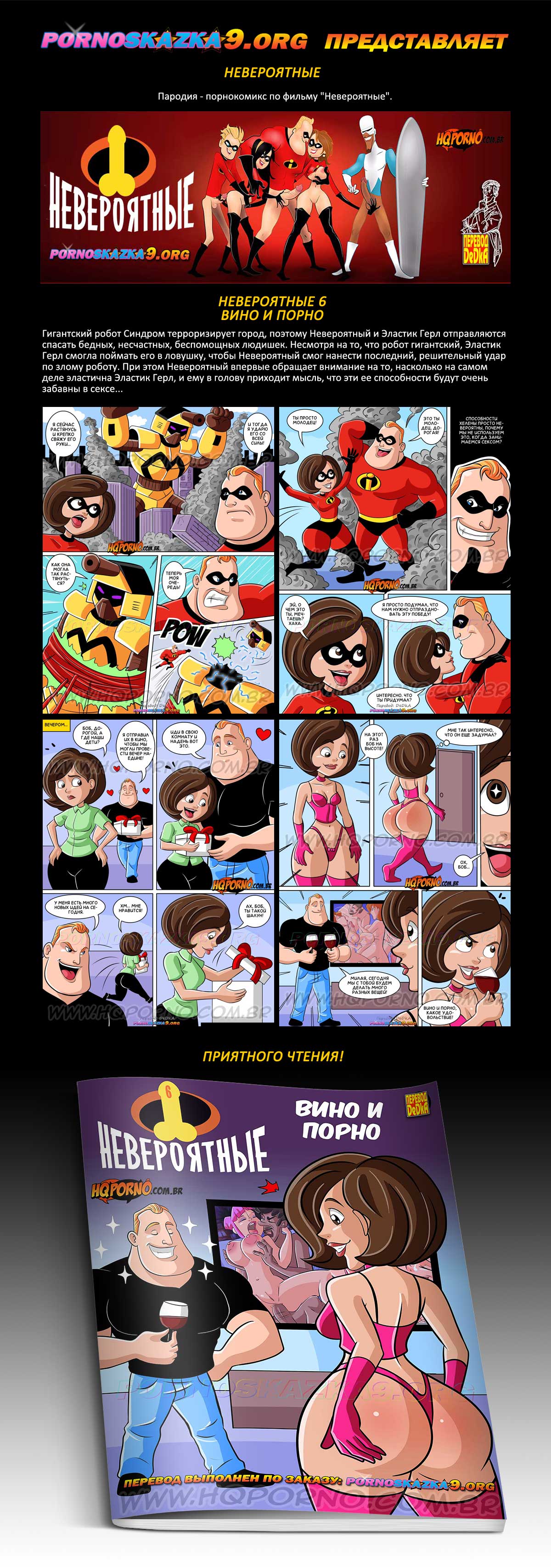 Порно комикс «Невероятные. Часть 6. Вино и порно.» Гигантский робот Синдром терроризирует город, поэтому Невероятный и Эластик Герл отправляются спасать бедных, несчастных, беспомощных людишек. Несмотря на то, что робот гигантский, Эластик Герл смогла поймать его в ловушку, чтобы Невероятный смог нанести последний, решительный удар по злому роботу. При этом Невероятный впервые обращает внимание на то, насколько на самом деле эластична Эластик Герл, и ему в голову приходит мысль, что эти ее способности будут очень забавны в сексе…