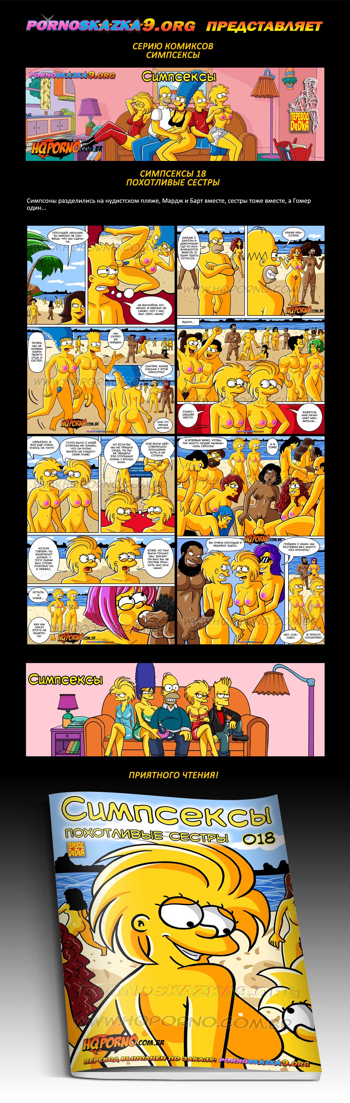 Порно комикс Симпсексы. Часть 18. Похотливые сестры. Симпсоны разделились на нудистском пляже, Мардж и Барт вместе, сестры тоже вместе, а Гомер один…